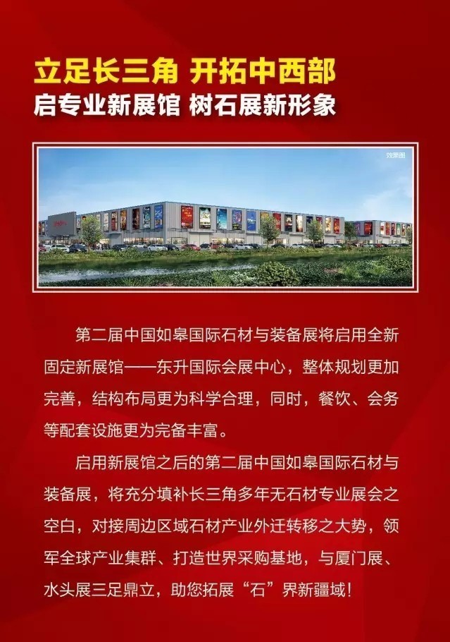 洪鴻志表示,今年第二屆如皋國(guó)際石材與裝備展將啟用全新固定的新展館——東升國(guó)際會(huì)展中心,新展館在整體規(guī)劃方面更加完善,結(jié)構(gòu)布局也更為科學(xué)合理,同時(shí),餐飲、會(huì)務(wù)等配套設(shè)施更為完備豐富。啟用新展館之后的如皋國(guó)際石材與裝備展,將充分填補(bǔ)長(zhǎng)三角多年無(wú)石材專業(yè)展會(huì)的空白,對(duì)接周邊區(qū)域石材產(chǎn)業(yè)外遷轉(zhuǎn)移之大勢(shì),領(lǐng)軍全球產(chǎn)業(yè)集群、打造世界級(jí)石材采購(gòu)基地,將與廈門展、水頭展三足鼎立。